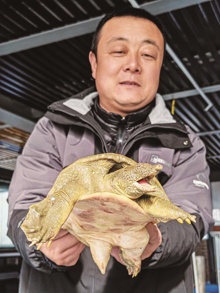 相比活泼好动的鱼虾蟹,常信乡光明渔村的“新居民”——1000多只中华鳖则稳重很多。银川科海生物技术有限公司销售总监刘伟从养殖池小心翼翼捞起一只已经成年的中华鳖,只见它缩脑伸头,笨拙呆萌,像极了《哪吒闹海》里憨态可掬的“龟丞相”。