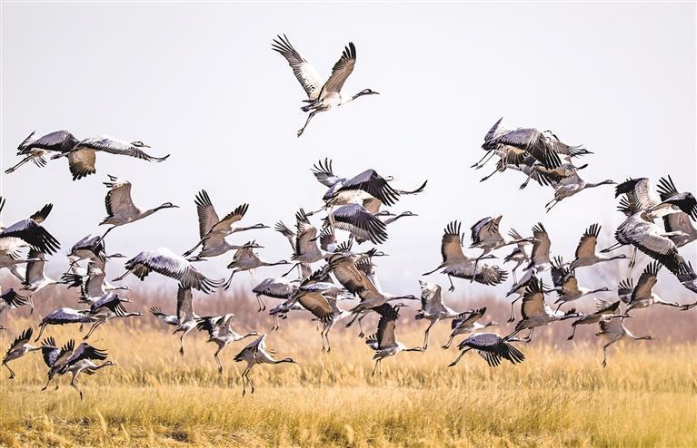 生态修复不仅是偿还历史“生态债”,更是为未来“储值”。天蒙蒙亮,石嘴山市惠农区迎河湾的芦苇荡里,在黄河岸边坚守了8年的“追鹤人”陈小组已顶着寒露蹲守了1个小时。顺着他的镜头对准的方向望去,2公里开外的黄河中央一片浅滩上,国家二级保护动物灰鹤成群结队,或追逐打闹,或低头觅食。