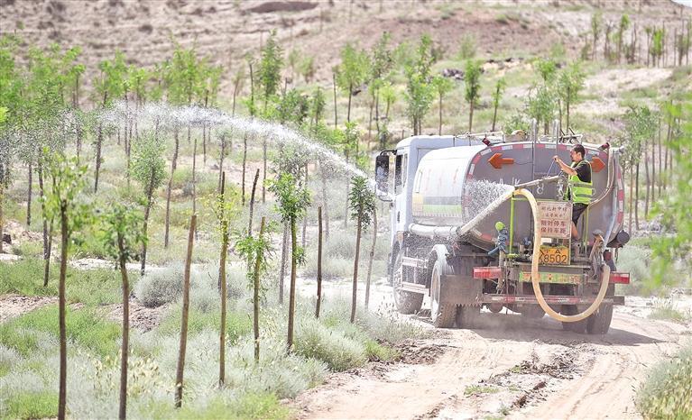 中卫市沙坡头区涩井沟历史遗留矿山生态保护与修复综合治理项目现场,工作人员正在为树木浇水。