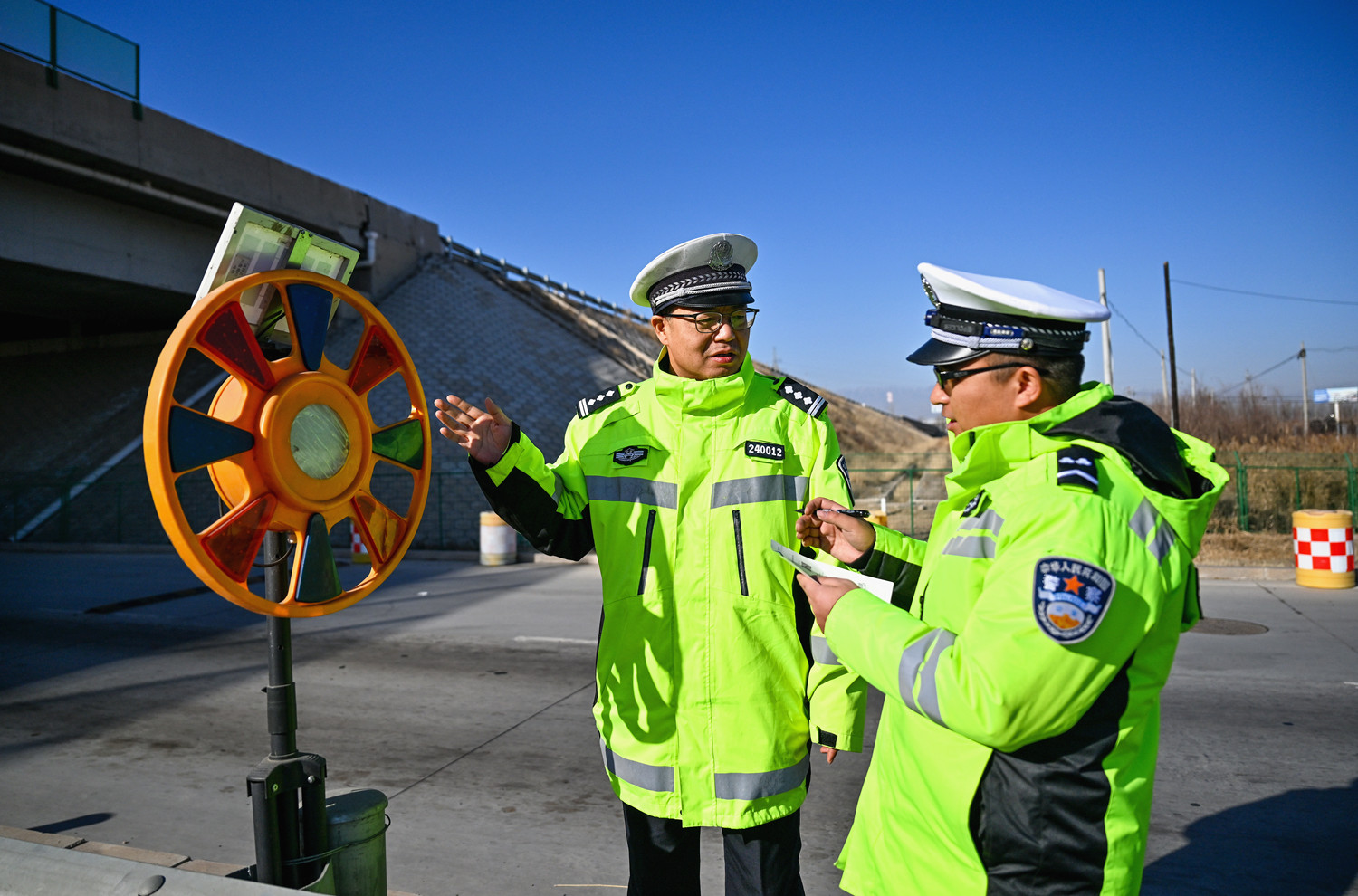 1月14日,石嘴山市公安局交通管理局民警检查京藏高速公路石嘴山路段上的爆闪灯。近日,石嘴山市开展高速公路、桥梁隧道等基础设施风险隐患排查,通过加密高速公路视频巡查和地面巡逻频次,打击酒驾醉驾和“三超一疲劳”等行为,确保群众出行安全。
