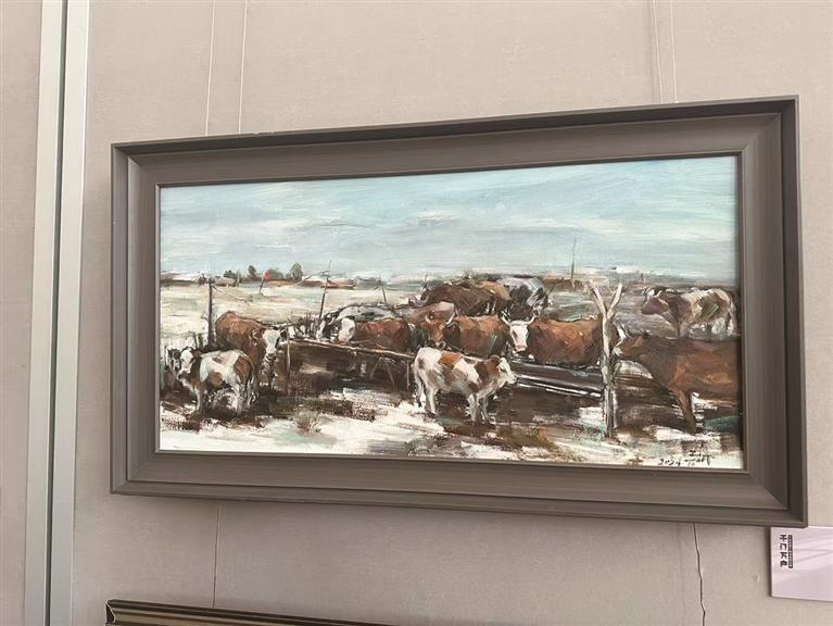 白桦木修葺的围栏里,黄白花奶牛此起彼伏的“哞哞”声,把牧场的清晨唤醒,也把牧民的脚步催动。深沉厚重的赭黄色拼接组合,夸张奔放的粗线条描绘勾勒,既充满了大写意的空间感,又不失工笔画的细腻感。