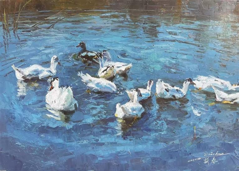 油画展现场,5岁的李可苗领着4岁的表妹曹诗玥,在戴春的作品《姑妈的鸭子》前认认真真地数池塘里有几只鸭子——“一共11只,1只黑的,1只花的,其他都是白的。”年过七旬的李光臣,和老伴专门从贺兰县赶到银川市金凤区观展,眼角的皱纹挡不住舒展的笑意;油画爱好者丁欣,拿着专业的摄影器材,逐幅拍照,准备回去细细品味……