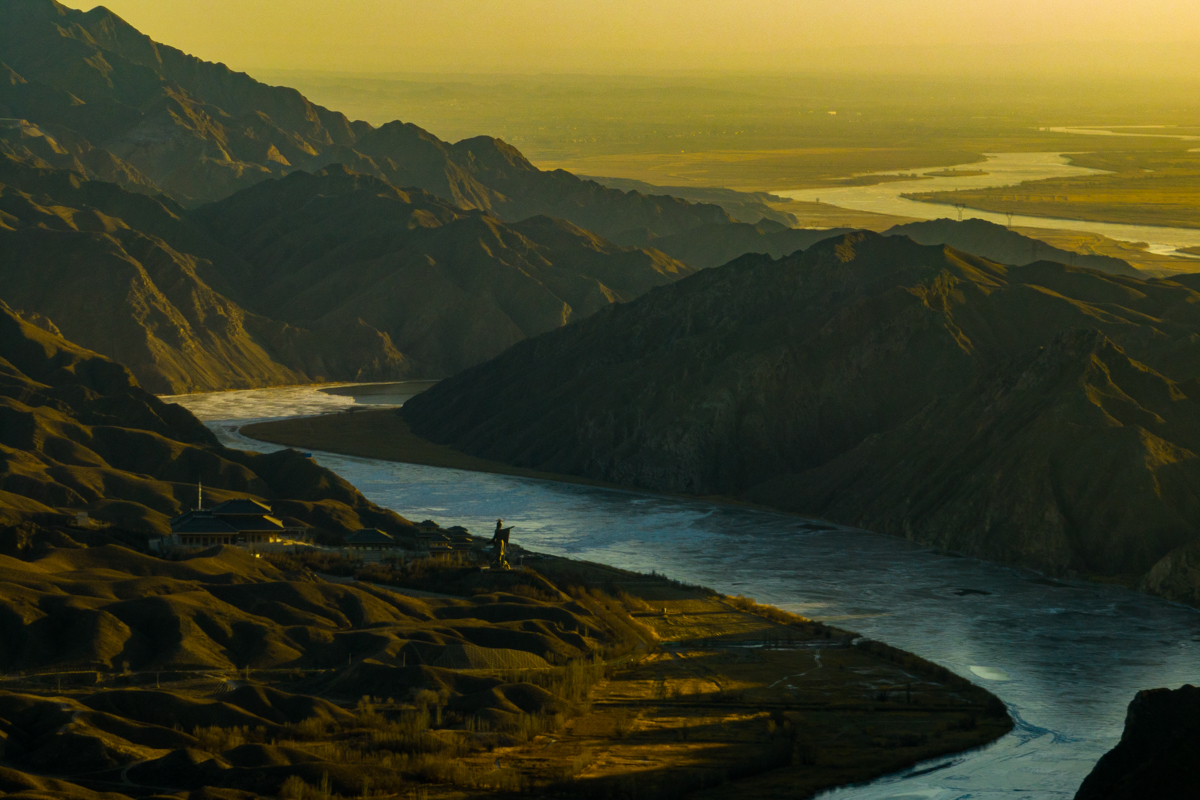 1月27日,宁夏天蓝水绿。连日低温,黄河青铜峡大坝处形成独特景观:一半凝固一半流水。黄河大坝以北为流水,而大坝以南则被淡绿色的冰覆盖,冰面直达青铜峡大峡谷入口处。夕阳西下,从空中俯瞰,绿色的流水和满峡谷翠色的冰面形成一道独特的冬日景观。(宁夏新闻网记者 祁瀛涛 摄)