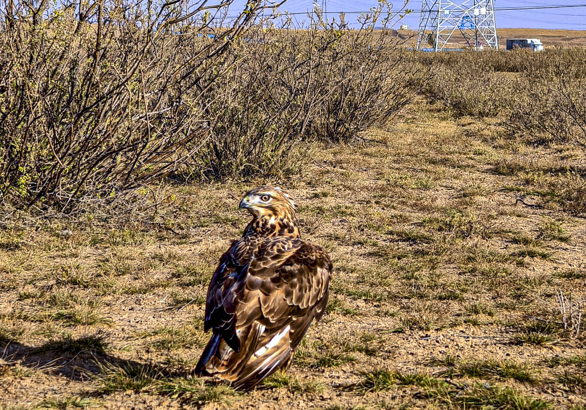 “这鸟看着像大鵟,是国家保护动物!”巡检人员立刻回忆起国网宁夏超高压公司此前组织的野生动物保护宣传培训内容,曾详细讲解过鹰类的外形特征、生活习性及保护级别,其标志性的灰褐色羽毛、锐利的喙部与爪子,与眼前这只猛禽高度吻合。意识到这是国家二级保护动物且处于受伤状态,巡检人员不敢怠慢,第一时间放缓脚步,避免惊扰到大鵟。经仔细观察发现大鵟翅膀有伤,羽毛略显凌乱,推测可能是意外撞击或捕食时不慎受伤,导致无法飞行。