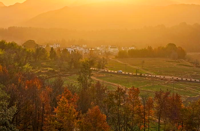 11月25日,安徽省黄山市黟县宏村镇协里村冬景缤纷,斑斓林木层层晕染,在晨光中更显浓郁色彩,与白墙黛瓦的徽派民居相映成趣,构成一幅冬日画卷。