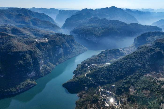 11月26日,航拍贵州黔西马路河大峡谷初冬景美。 初冬时节,贵州省黔西市素朴镇马路河大峡谷河水清澈,崖壁陡峭。蜿蜒的乌江河流与峡谷相互映衬,构成一幅初冬山水画卷。
