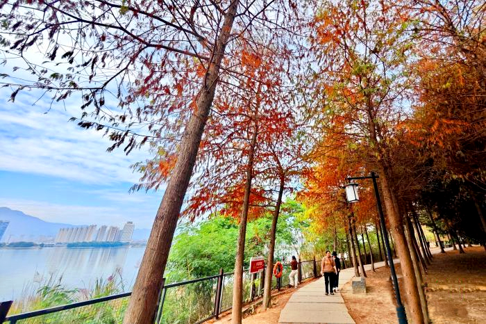11月24日,游客在变红的水杉林里游玩。初冬时节,福建福州乌龙江湿地公园美景引游人。