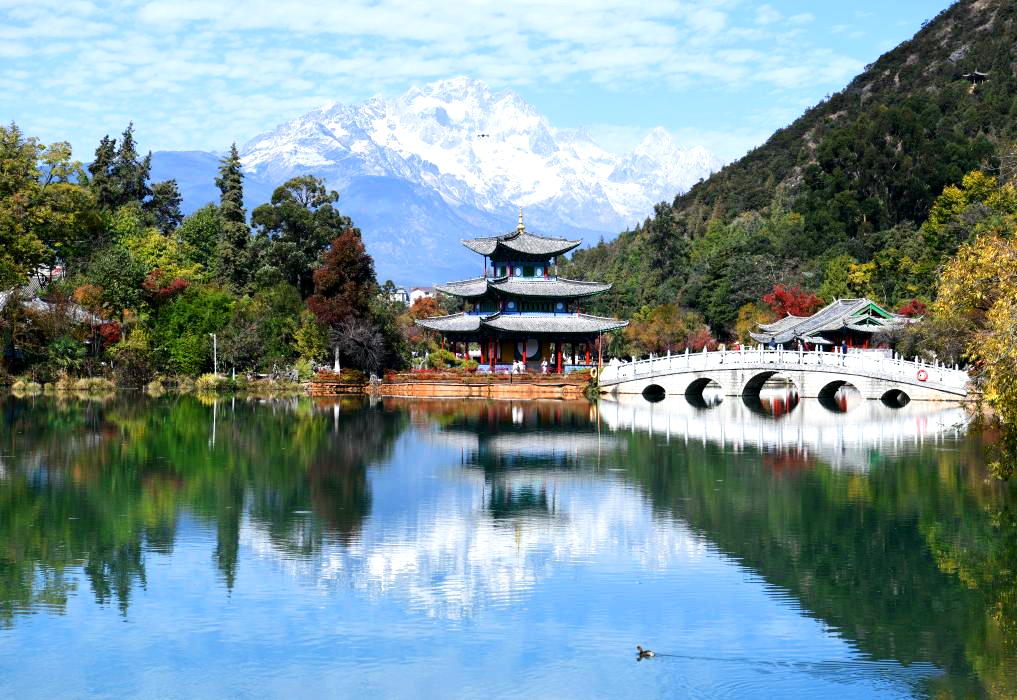 初冬时节,云南丽江玉龙雪山与山下层林互相辉映,美不胜收。