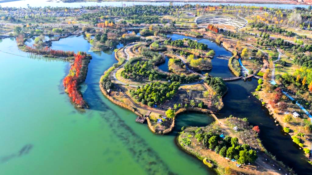 近日,位于湖南省长沙市的松雅湖国家湿地公园内水杉树叶颜色开始转红,色彩斑斓的美丽图景吸引不少市民前来游玩打卡。