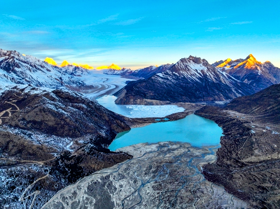 2025年12月1日,西藏昌都,八宿县然乌镇来古村,来古冰川迎来冬季最佳观赏期,风光壮美动人。来古冰川冰体晶莹剔透,与雪山、民居、湖水、朝霞相映成趣,展现出独特海洋性冰川的壮美奇观,让人流连忘返。