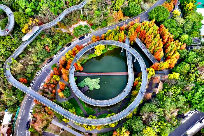 12月22日,空中俯瞰福建福州福道,周边的水杉林渐渐换上了红色“新装”,吸引许多市民和游客前来观赏。水杉林主要沿福州梅峰山地公园内的归水潭种植,福道两侧水杉夹道而立,成为冬日里一道别致的风景线。