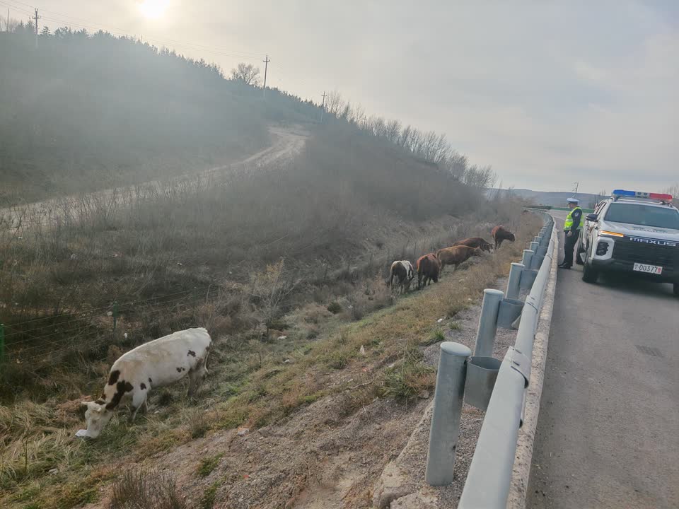 2025年11月20日,固原高速交警三大队民警在日常巡逻至青兰高速1622公里处时,发现一男子正带着一群牛在高速护栏外侧的边坡上放牧,部分牛只距离护栏仅数米,过往车辆疾驰而过,情况十分危险。