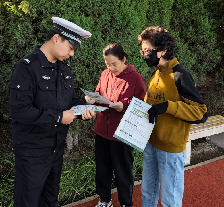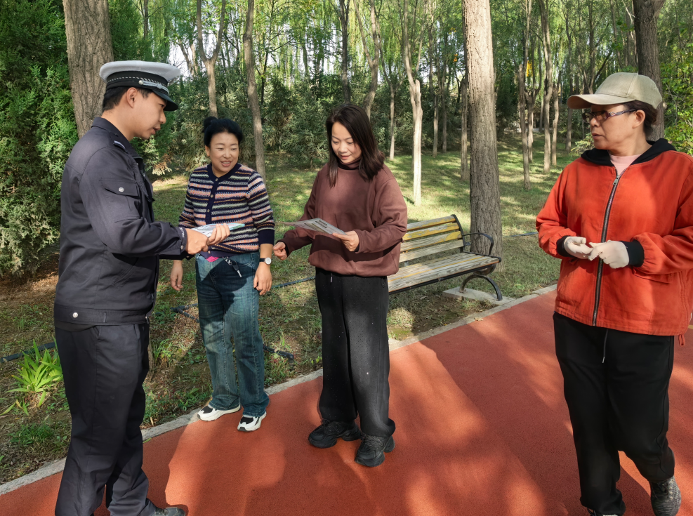 10月14日上午,吴忠交管二大队宣传员携带交通安全宣传彩页走进辖区母子公园,为晨练的市民普及安全知识,将法律法规转化为易懂的日常提醒。