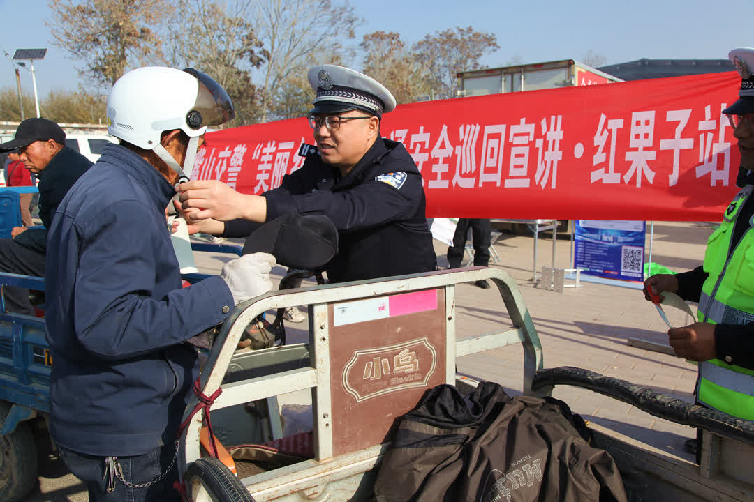 11月5日,石嘴山市公安局交通管理局民警在惠农区燕子墩乡第二届“全羊宴”活动现场开展“美丽乡村行”宣传活动,向农民群众赠送安全头盔,发放安全出行、反诈宣传资料,为电动车粘贴反光标识,受到农民群众的热烈欢迎。