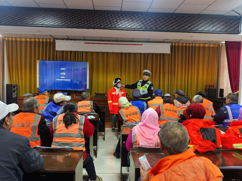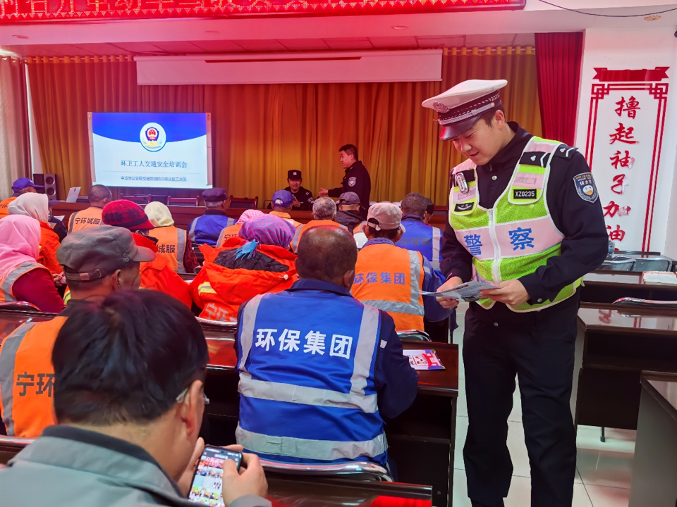 11月12日下午,中卫市公安局交通管理局沙坡头区三大队联合宣和派出所,为中卫市环保集团宣和分站的50余名环卫工人开展道路交通安全及反诈宣传活动。