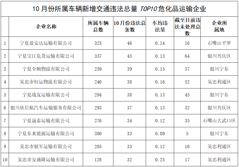 为进一步加强危化品运输企业和车辆的安全监管,借助交通安全宣传和警示教育,强化社会监督和舆论倒逼,督促企业落实安全管理主体责任,倡导遵法守规明礼的文明交通行为,宁夏公安厅交通管理局梳理了202510月份全区交通违法突出的10家危化品运输企业进行曝光。