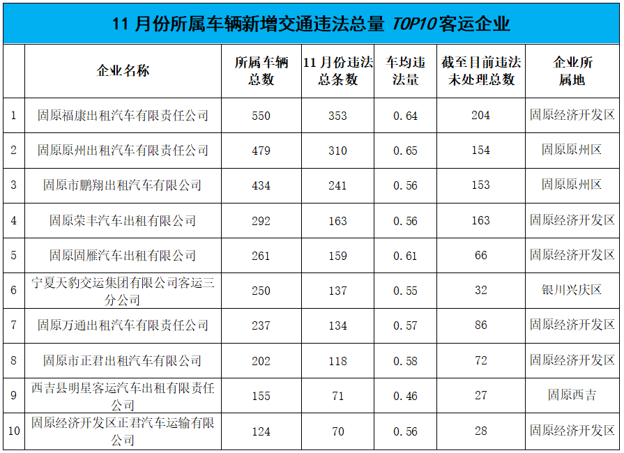 经过统计分析发现:与上月相比,11月份所属车辆新增交通违法量最多的10家客运企业中,有9家企业再次“上榜”,有9家为固原地区客运企业。排在“榜首”的企业依旧是固原福康出租汽车有限责任公司(353条),同时也是截至目前违法未处理数最多的企业(204条);车均违法量最多的企业是固原原州出租汽车有限责任公司(0.65条)。11月份全区交通违法量最多的客运车辆分别是张成兵的宁AT0902(11条)、固原市天豹网约车服务有限公司的宁DFS710(10条)。具体曝光名单如下: