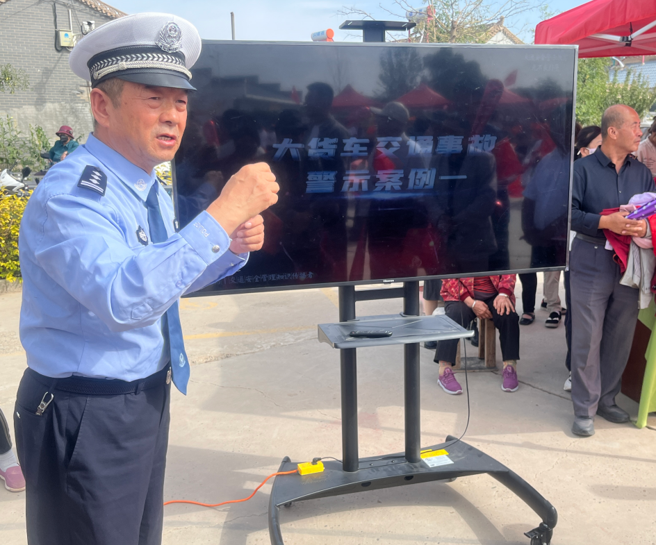 民警结合农村群众交通安全知识淡薄和出行特点,讲解日常出行交通安全常识。同时,还通过发放交通安全宣传资料,图文并茂地向村民们详细讲解酒后驾车、疲劳驾驶、超员超载、三轮车违法载人以及骑乘摩托车和电动车不戴安全头盔、驾乘汽车不系安全带等重点违法行为的危害及严重后果。播放大货车交通事故警示案例宣传教育片,结合近期发生的典型交通事故案例,深入分析群众出行时常见的交通违法行为和交通陋习,用通俗易懂的语言,倡导大家争做文明交通的参与者、宣传者和监护者,将交通安全理念传播得更深更广更远,进一步增强农村群众的出行安全意识和守法意识。