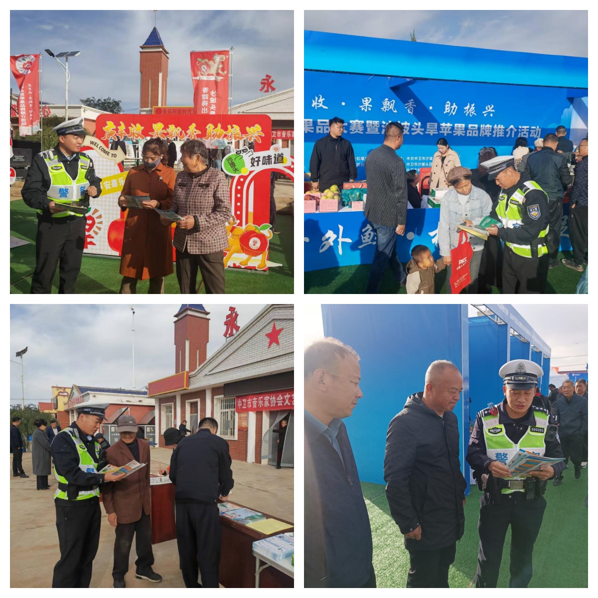 10月15日上午,中卫市公安局交通管理局沙坡头区三大队利用辖区永康镇乐台村旱苹果品牌推介活动人员集中的特点,联合辖区派出所民警深入推介活动现场,为群众和忙碌丰收的果农、运输人员宣传交通安全知识,全力护航苹果采摘运输季。