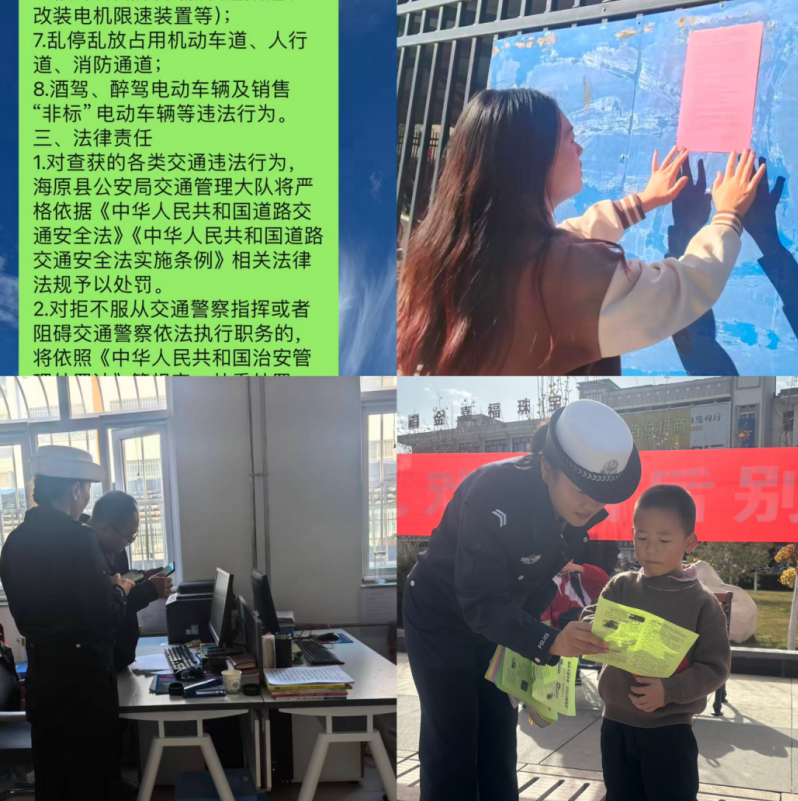 为进一步规范秋冬季道路交通秩序,有效预防和减少因电动车引发的道路交通事故,切实保障人民群众生命财产安全,海原县公安局交通管理大队紧密结合当前道路交通安全形势,聚焦电动车违法载人、驾乘人员不按规定佩戴安全头盔等突出违法行为,自11月4日起,在全县范围内开展秋冬季电动自行车交通安全专项整治专项行动。
