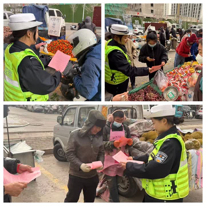 民警结合集市人员密集、车流集中的特点,在商贸城主出入口发放交通安全手册,开展现场讲解,向过往群众普及交通安全知识。针对集市贸易中常见的农用车违法载人、摩托车未佩戴安全头盔、电动车逆行、行人随意横穿马路等交通违法行为,民警用通俗易懂的语言讲解其危害性及相关法律法规,结合本地典型事故案例,以案释法引导群众摒弃交通陋习。