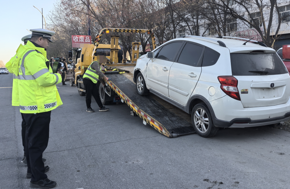 整治行动采取劝导整改+依法拖移模式,确保整治有力度,更有温度。对能查询到车主及商户信息的,执勤民警第一时间电话联系,明确告知其长期占用公共停车位的违法行为及安全隐患,耐心宣讲相关交通法规,督促商户限期将车辆移至合法经营区域;对多次通知拒不整改、无法联系车主或无牌无证的“僵尸车”,安排专业拖车将车辆安全拖移至指定停车场妥善存放,切实消除道路安全隐患。同时,民辅警在整治现场开展面对面交通安全宣传,向周边二手车商户普及公共资源共享理念,引导商户自觉规范停车经营行为,主动参与交通秩序维护,共同营造文明有序的通行环境。