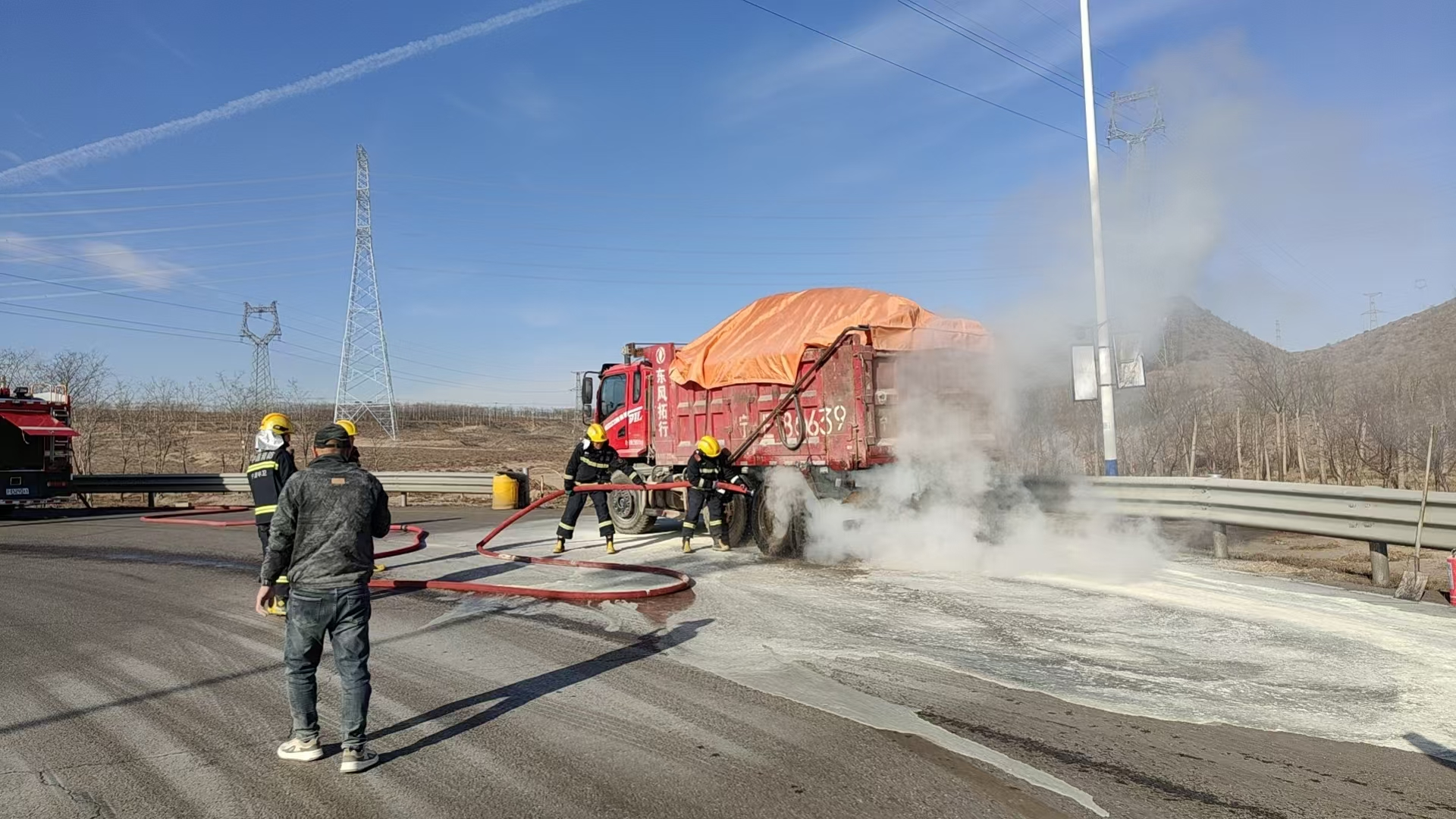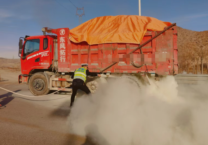 “太危险了!多亏交警同志反应快,不然火势蔓延,后果不堪设想。”12月4日10时20分,中卫市公安局交通管理局高速公路二大队民警驾驶警车巡逻至宁钢4号门附近,发现一辆宁E号牌中型自卸货车后轮胎冒烟着火。危急时刻,高速公路二大队巡逻民辅警火速处置扑灭明火,及时消除安全隐患。