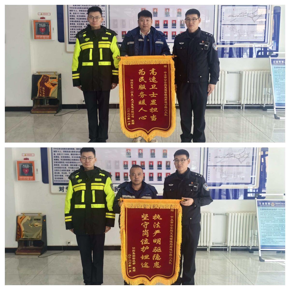 为表达感激之情,1月12日上午,明阳智慧(宁夏)风力发电有限公司与明阳集团物流部分别向高速公路二大队送上两面写着“高速卫士显担当 为民服务暖人心”“执法严明驱隐患 坚守岗位护坦途”的锦旗。(中卫市公安局交通管理局高速公路二大队 陆彦云)