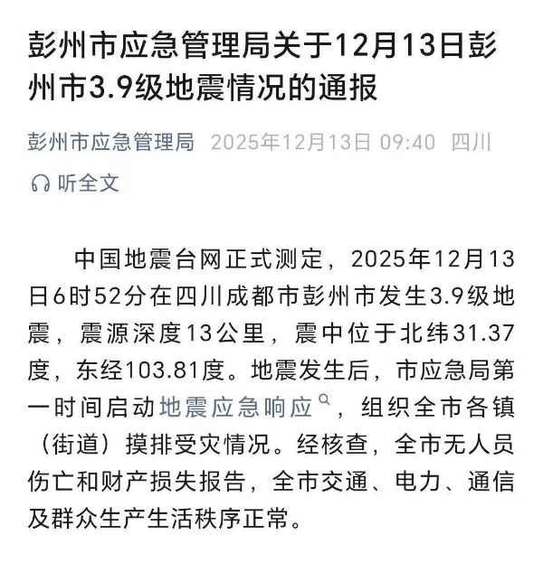 2025年12月13日6时52分在四川成都市彭州市发生3.9级地震,震源深度13公里,震中位于北纬31.37度,东经103.81度。经彭州市应急局全面核查,全市无人员伤亡和财产损失报告,全市交通、电力、通信及群众生产生活秩序正常。