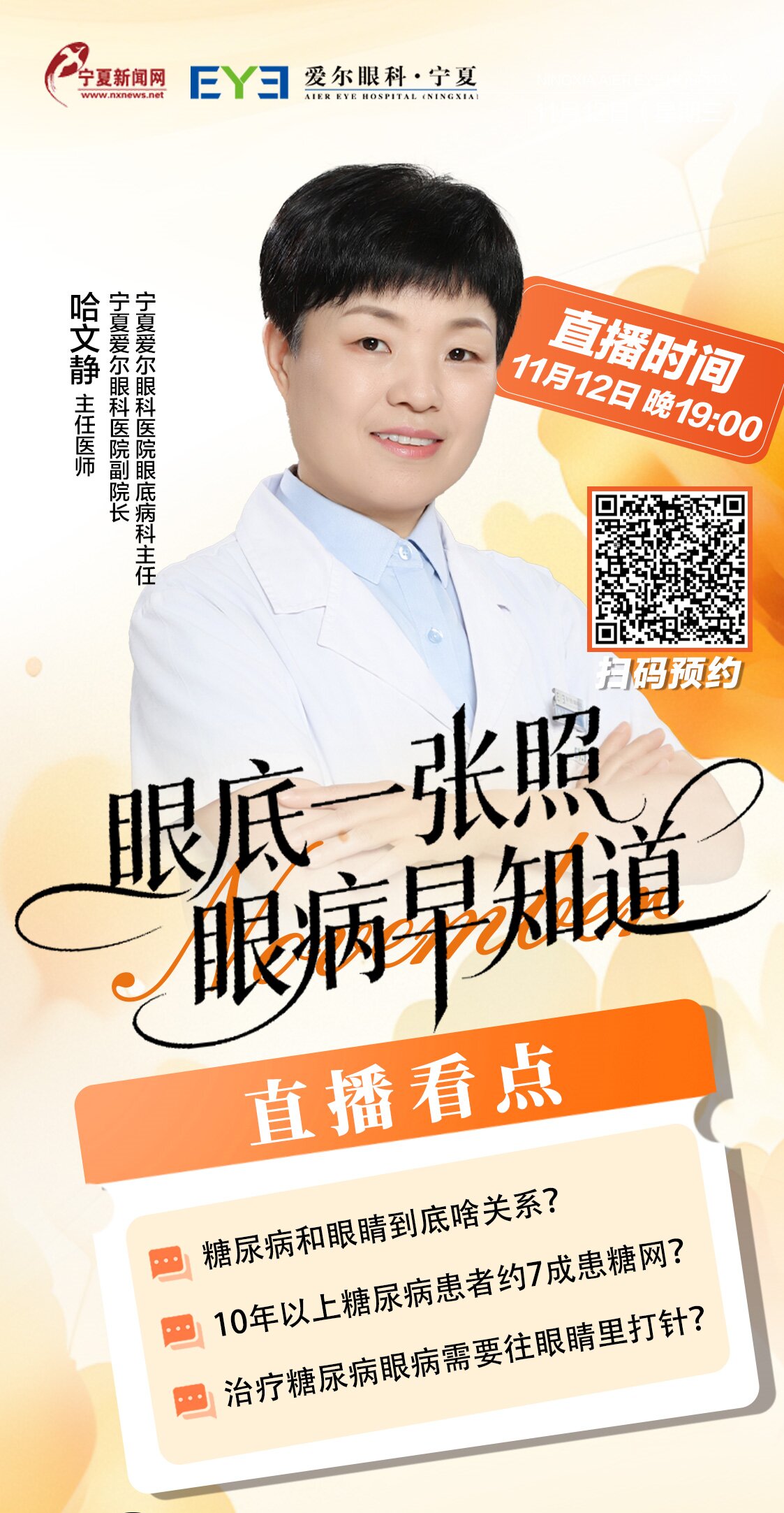 在实际生活中,大部分患者对糖尿病眼病的认知、治疗了解不足。为普及糖尿病患者的爱眼护眼知识,提高他们的健康医疗意识,帮助他们远离失明威胁,宁夏爱尔眼科医院联合宁夏新闻网将于11月12日(周三)19点开展公益直播科普活动。