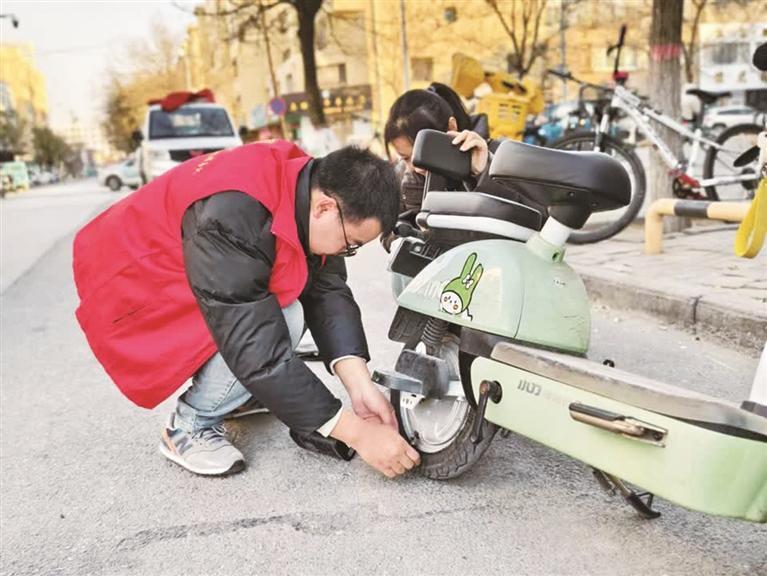 11月24日早晨,外卖骑手李吉云在银川市兴庆区中山北街与上海路路口附近帮一位路人给车胎充气。李吉云是兴庆区丽景街街道银虹社区“暖宝宝”新就业群体志愿服务队负责人。这支服务队成立于今年9月,由外卖骑手、快递小哥等组成,他们平日是城市“摆渡人”,工作之余化身“暖宝宝”,将温暖传递给更多需要帮助的人。记者 安小霞 摄