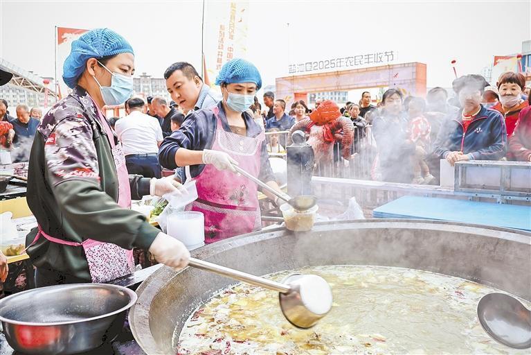 盐池县2025年“中国农民丰收节”暨滩羊美食文化旅游系列活动现场,9口大锅同炖羊肉。