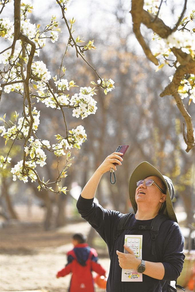 “这里靠近母亲河,梨园仿佛无边无际,百年古树屹立不倒。”来自香港的游客韩钰琪刚下车,就被眼前的景象深深吸引。她举着手机原地转了一圈,镜头里是铺天盖地的白,不禁赞叹:“这是在其他地方看不到的景色。”