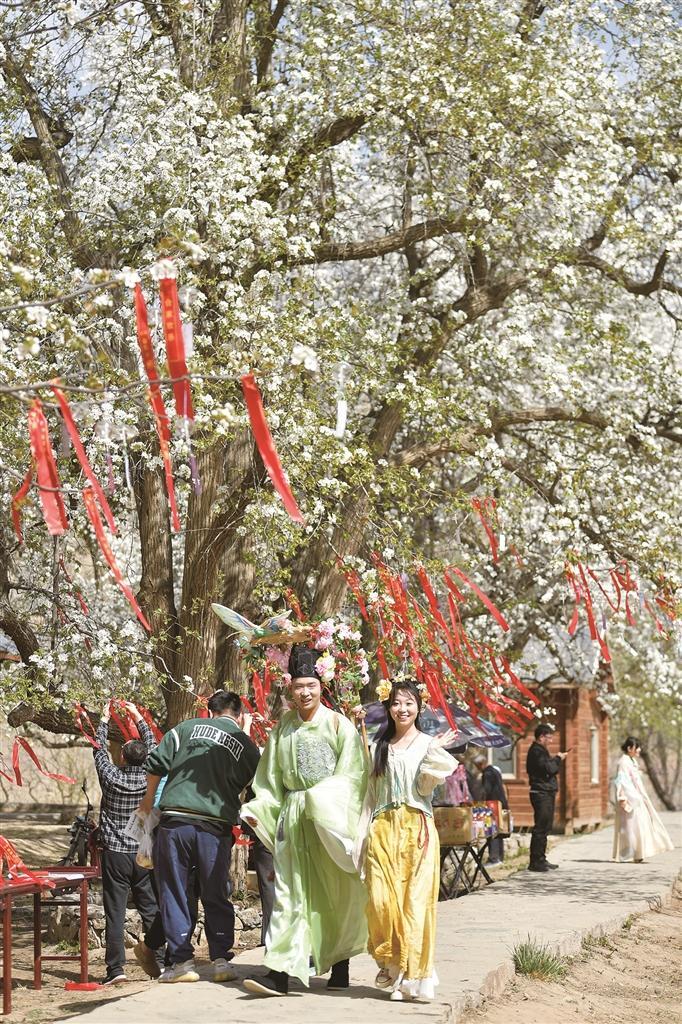 梨园里,身着飘逸汉服的姑娘提着竹篮,将鲜花递到孩子们手中;簪花郎手持银簪,熟练地为驻足游客将梨花别在发髻,鬓边的白与衣袂的青相映成趣。游客们纷纷举起相机,将这些生动的画面定格。