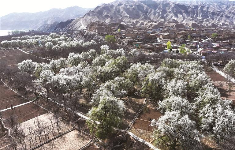 4月的黄河水裹着春汛的问候,在峡谷间奔腾不息,一路向东。上船、渡河,沿着蜿蜒的山路拐进中卫市沙坡头区迎水桥镇南长滩村,眼前豁然开朗——一片百年梨园,正把积蓄了一个冬天的力量,全部开成枝头的雪白。阳光从密密的花隙间筛落,空气里满是清甜的味道,远处的黄河在阳光下泛着金光,与这片白色花海相映成诗。这画面,像极了一幅厚重而温润的浮雕。