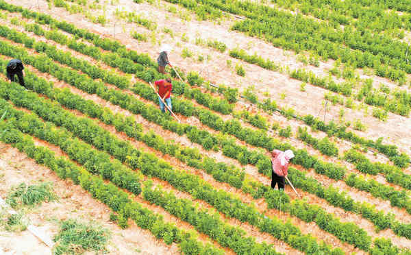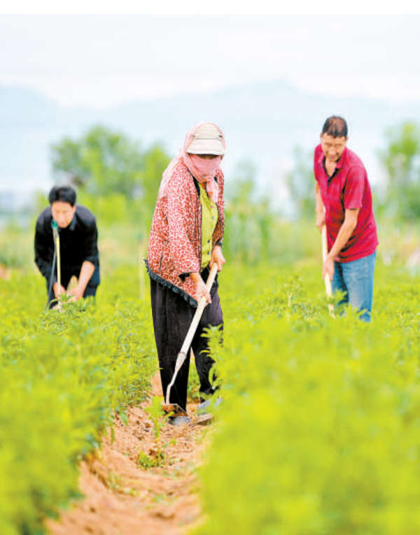 在孔雀村,120亩中草药长势喜人,村民们忙着在田间除草作业。