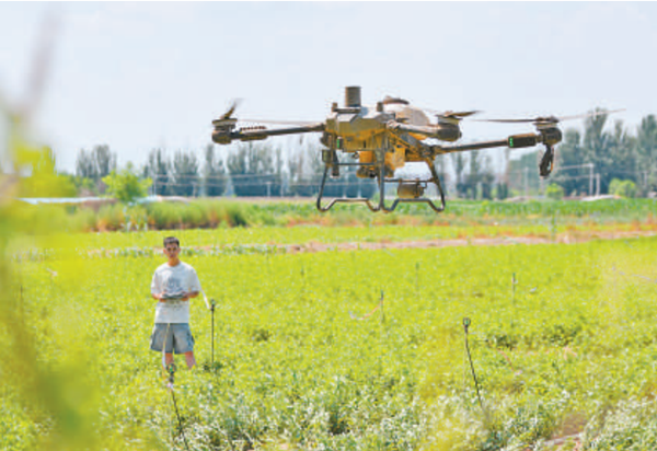 农技人员使用植保无人机为白术苗喷洒农药。