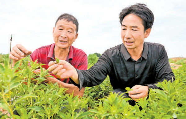 7月17日,银川市兴庆区掌政镇孔雀村,宁夏锦晨农业技术开发专业合作社负责人司学忠(右)查看中草药长势。