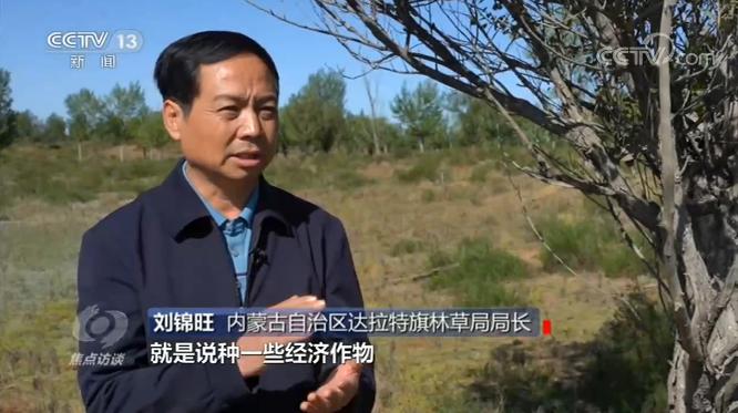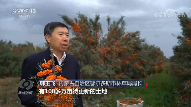 内蒙古自治区达拉特旗林草局局长刘锦旺说:“种一些经济作物,比如说沙棘,在经济林底下种一些中药材,能够产生经济效益,吸收了社会力量和社会资本和国有林场进行合作。合作以后生态效益也有了,生态功能也提升了,经济效益也有了,所以社会力量进入合作的时候,也有了积极性,也给老百姓拓宽了增收的渠道。”