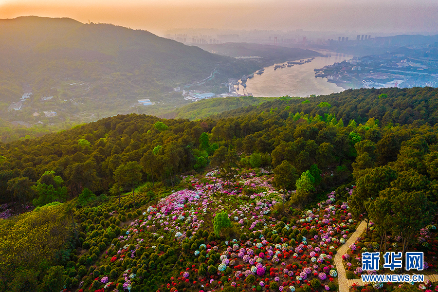 无人机视角下盛开的放牛村杜鹃花与长江同框。新华网发(郭旭 摄)
