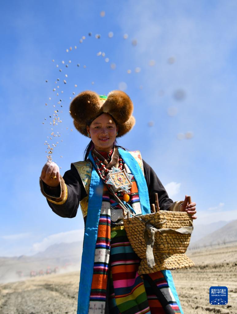 村民在西藏日喀则市江孜县努康村参加春耕仪式时播撒种子(3月16日摄)。新华社记者 晋美多吉 摄