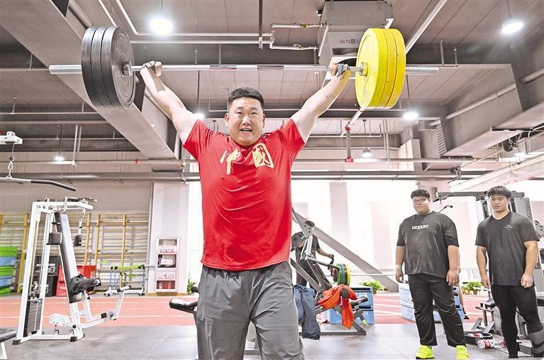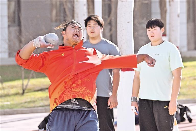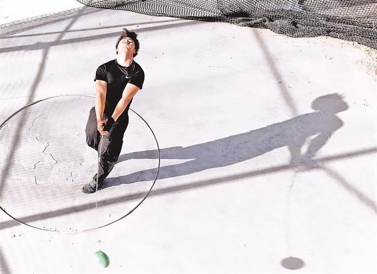 20岁的运动员夏国源在训练场上奋力投掷铅球,不断突破自己。