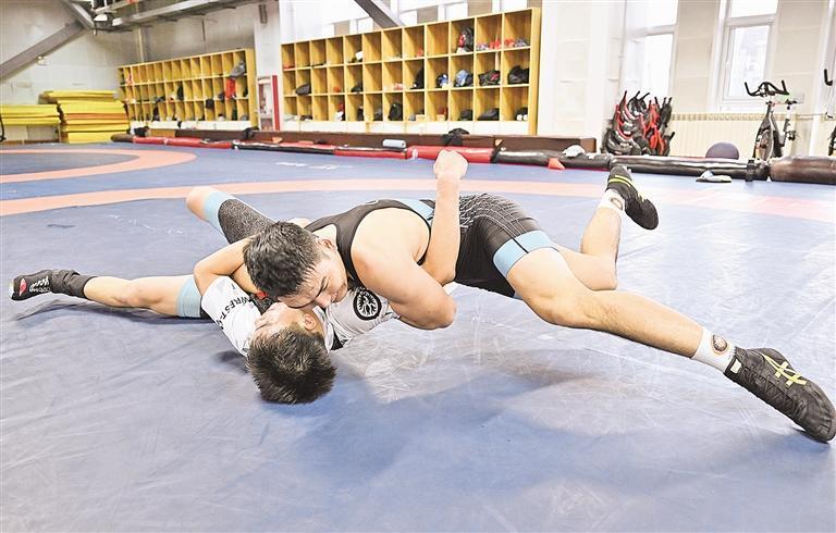 宁夏摔跤队的运动员在教练的指导下挥汗如雨,侧摔、过肩摔,不断重复上演。
