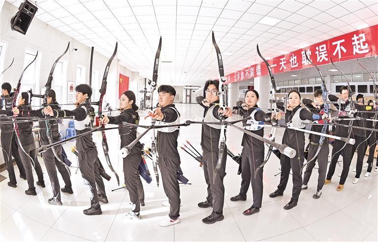 宁夏射箭队的运动员在射箭馆内集训,全力备战全国射箭锦标赛(室内)。