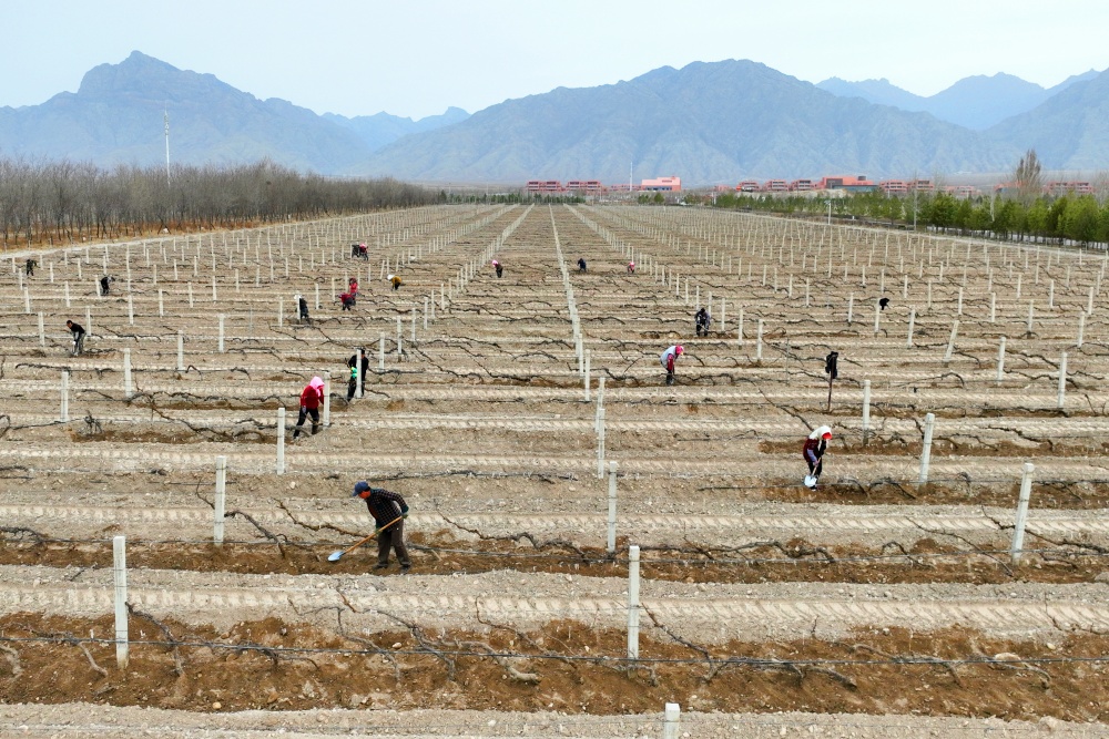 ‍3月25日,位于宁夏贺兰山东麓葡萄酒产区的沃尔丰酒庄种植基地,工人进行展藤作业。目前,贺兰山东麓葡萄酒产区已全面进入展藤作业高峰期。记者 王鼎 马赛尔 摄
