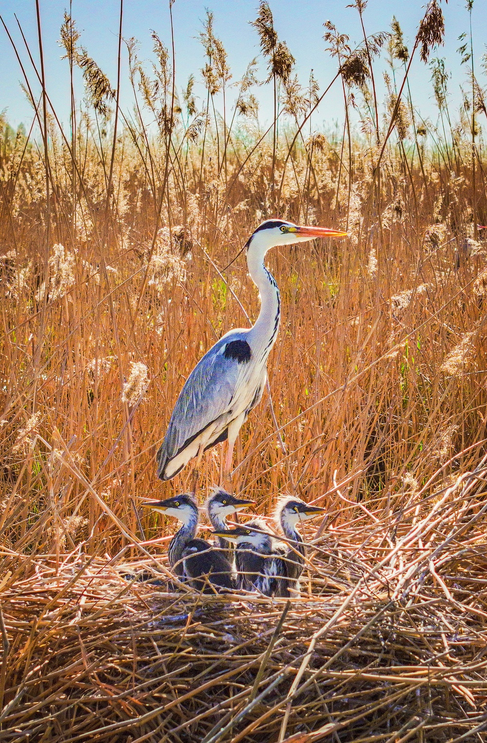 4月14日,宁夏沙湖自然保护区湿地,一只成年苍鹭守护着巢中幼雏。