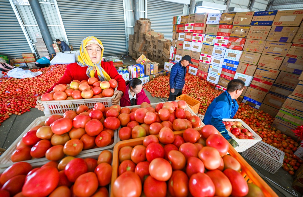 4月16日,银川市金凤区良田镇和顺新村果蔬仓储分拣中心内,工人忙着将刚采摘的西红柿分拣、装箱。目前,和顺新村已成为西红柿田间交易核心集散地,日均交易量近200吨。2025年,和顺新村西红柿交易量达6万余吨,全年交易额突破2亿元,为村集体创收80余万元。记者 马楠 王洋 摄