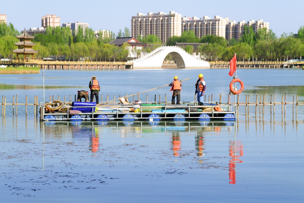 4月14日,银川宝湖公园,施工人员进行打桩作业。今年,宝湖公园将进行升级改造,打造集运动健身、戏水观鸟、生态康养于一体的“美丽河湖样板区”,为市民提供功能齐全的休闲观光打卡地。宁夏日报报业集团全媒体记者 高晓刚 摄