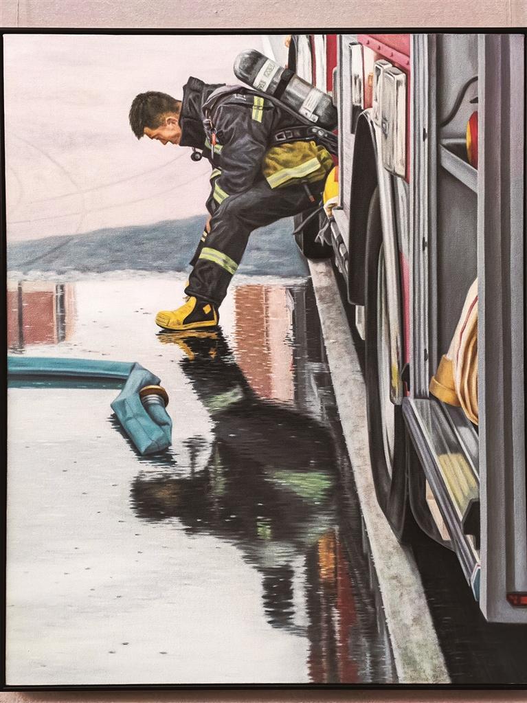 如果贴近画作细看,能看到画家一笔笔反复涂抹的痕迹:一道道颜料压实堆砌,呈现出富有层次感的立体效果,让蓝色的天空更透彻,让黄色的河水更辽阔,让白色的大坝更雄伟。