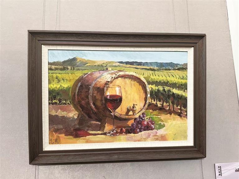 如果你是来自远方的朋友,来到宁夏一定要品一杯葡萄酒。画家毛一霖的作品《葡萄酒》就是这样一幅秀色可餐的佳作。远处,有贺兰山下一望无际的葡萄园,近处,是刚刚采摘下来的新鲜葡萄果,画面正中间的橡木桶里,葡萄酒在发酵酝酿,准备开启一场色与味、气与香的蝶变之旅。